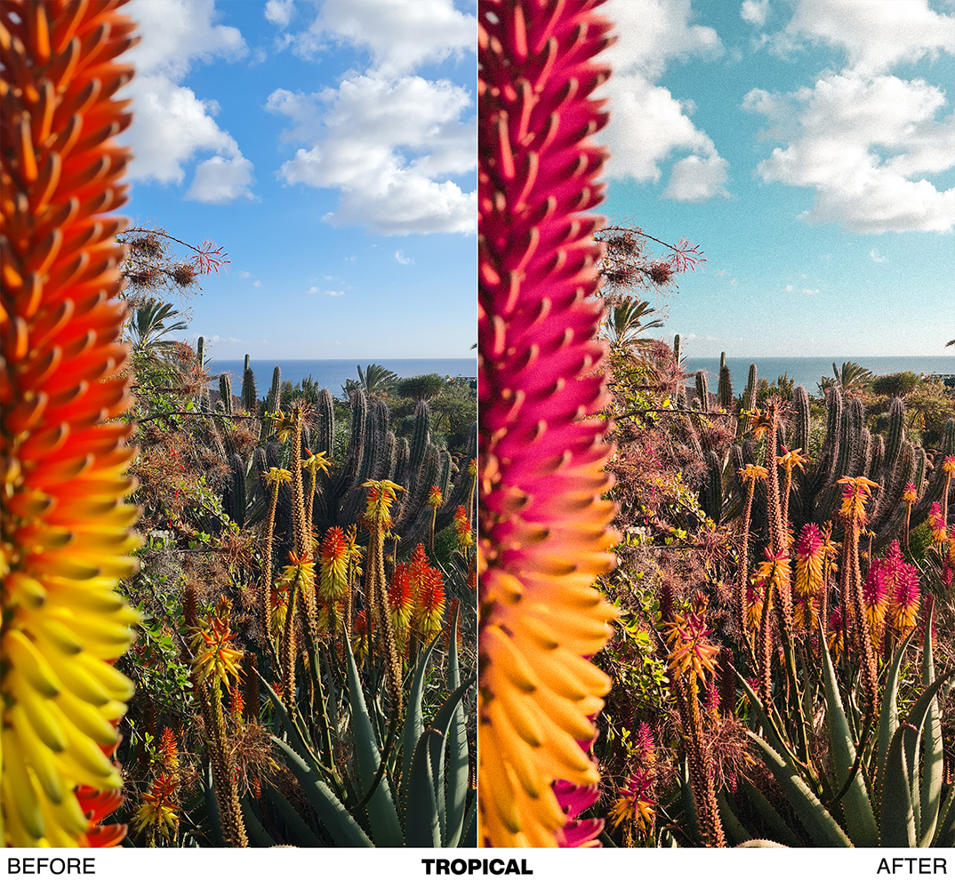 - TROPICAL → this preset creates the best results when used on photos taken during the day. It turns red tones into deep pink tones. Retro look & feel.