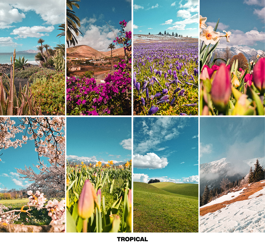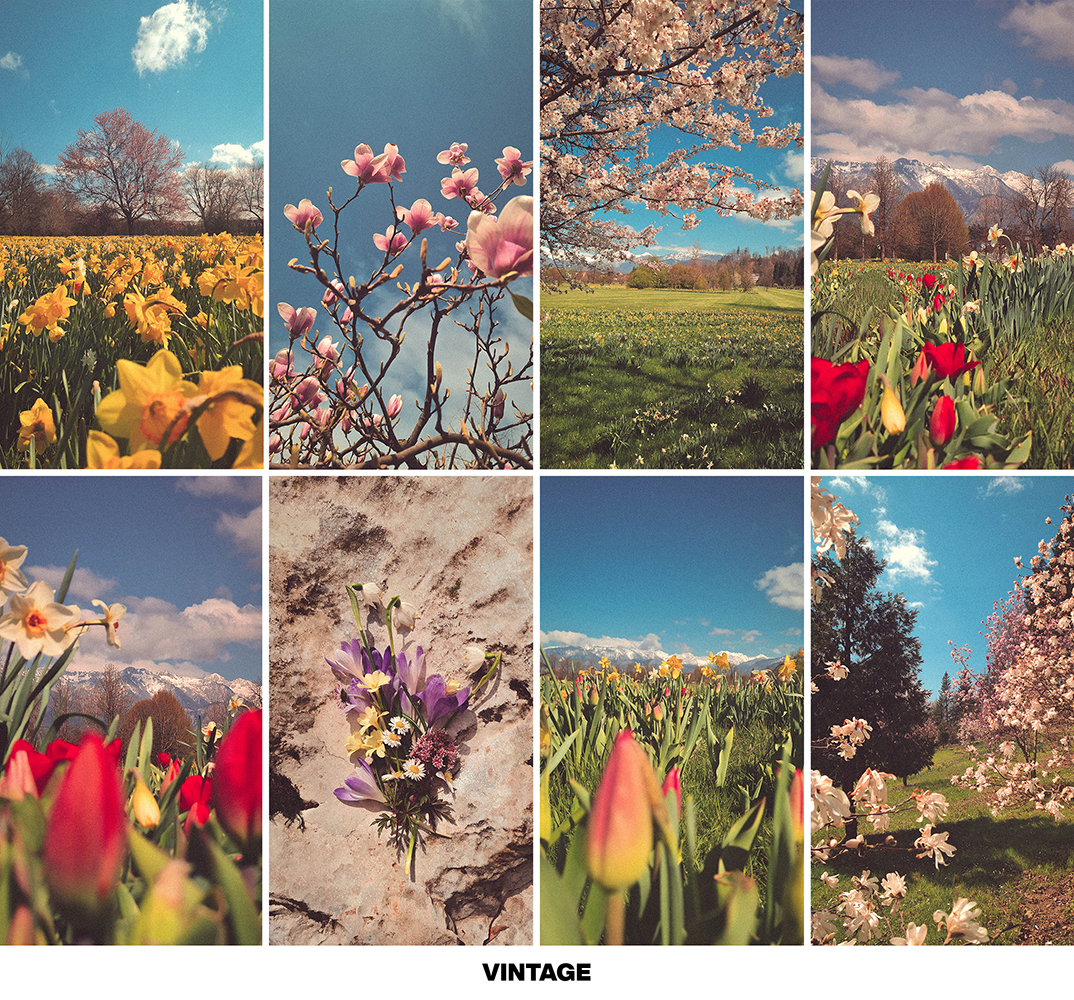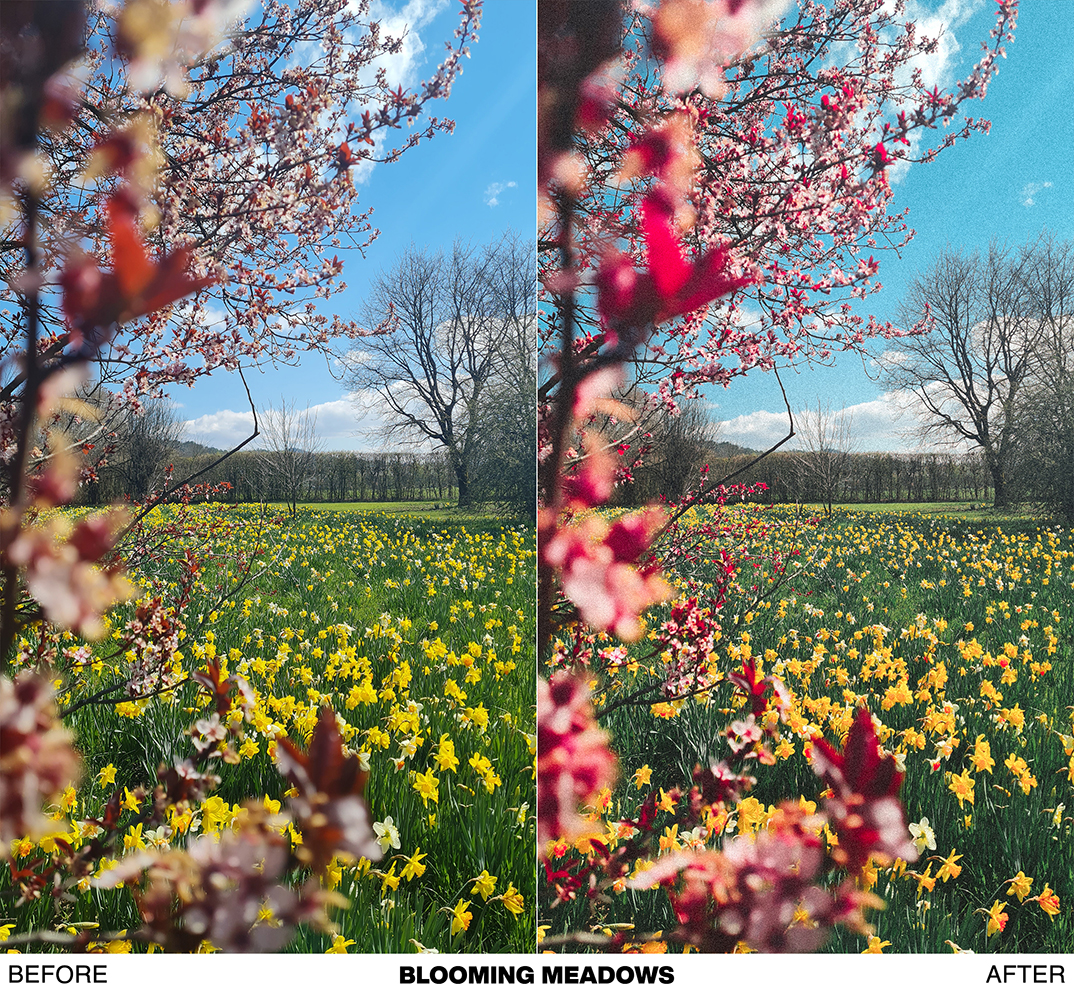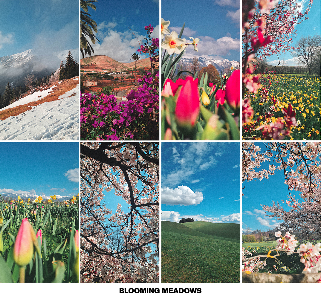 - BLOOMING MEADOWS → great preset for photos of blooming meadows, flowers, gardens, and blooming trees. Vibrant floral colors.
