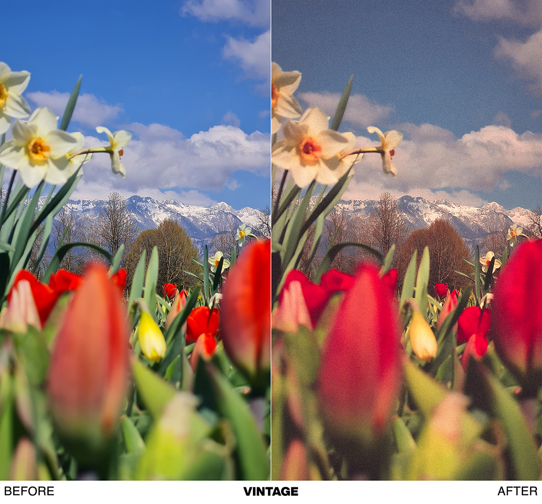 - VINTAGE → works best on photos taken during the sunny daylight, retro feel, analog film look. Vintage postcard feel.
