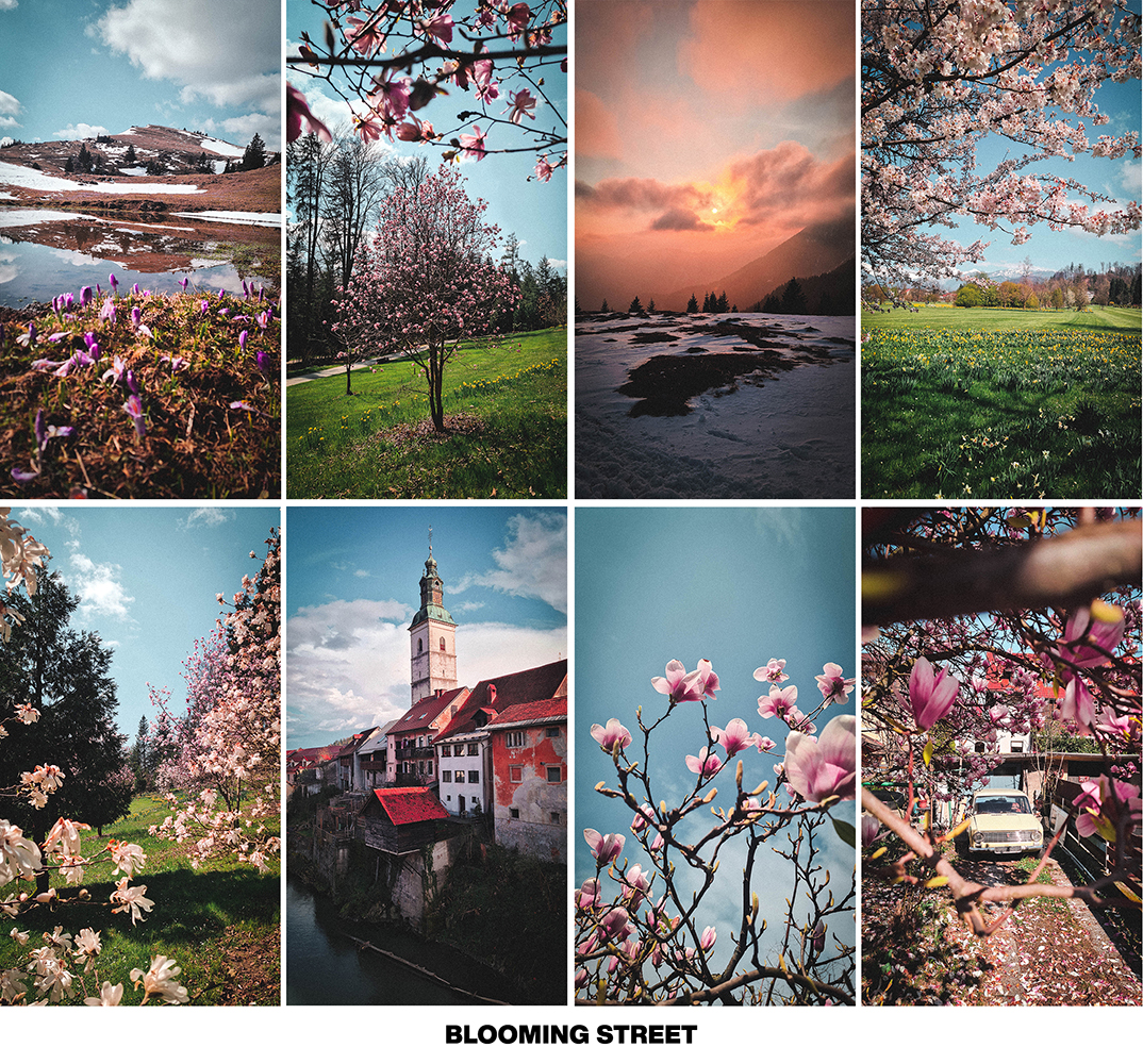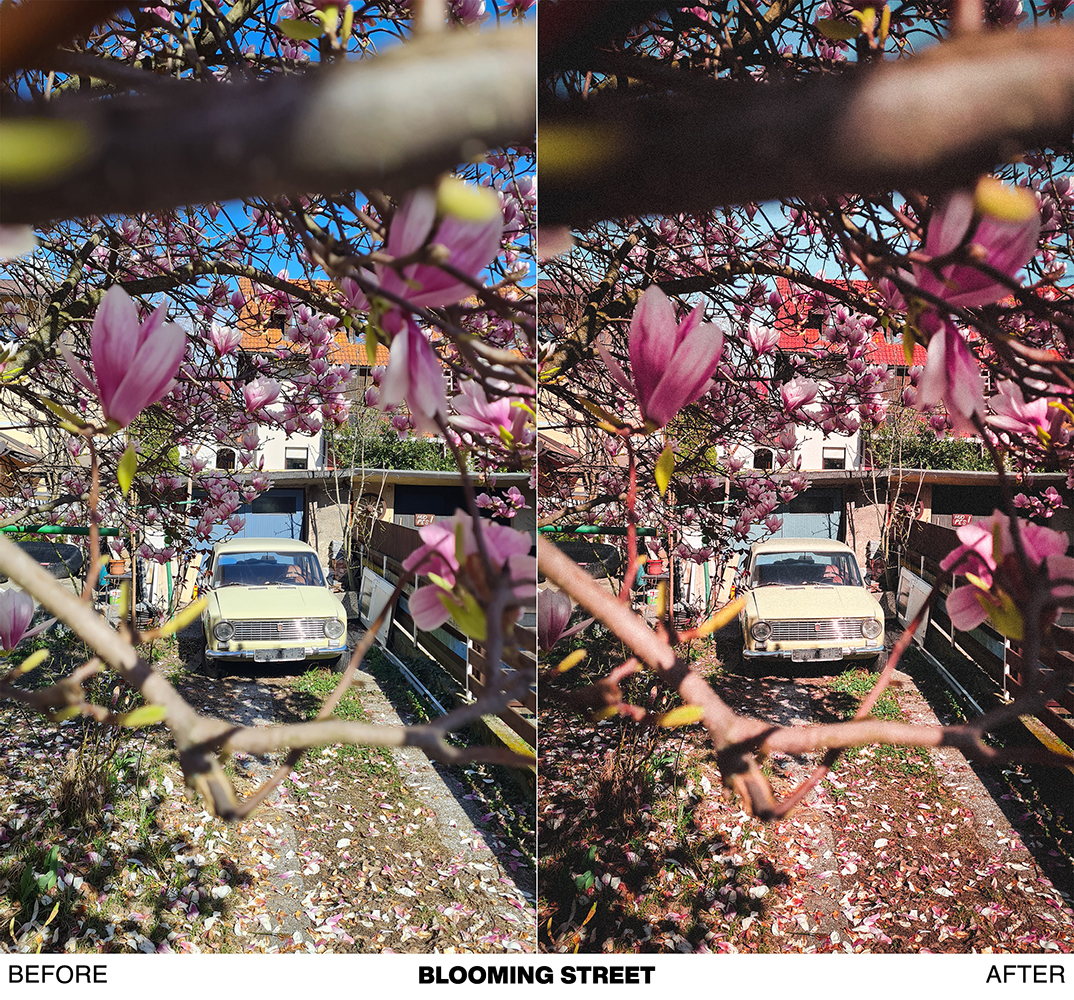 - BLOOMING STREET → best preset for street photography, architecture, and blooming trees. It gives the best results when used on photos taken on a bright sunny day. Fresh look & feel.