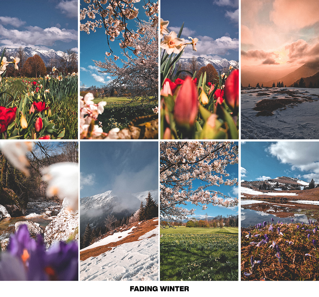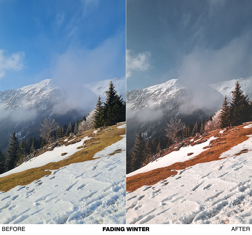 - FADING WINTER → great preset for photos taken in early spring when the snow hasn’t melted completely yet. Works beautifully on mountain photos. Combination of vintage and contemporary look.