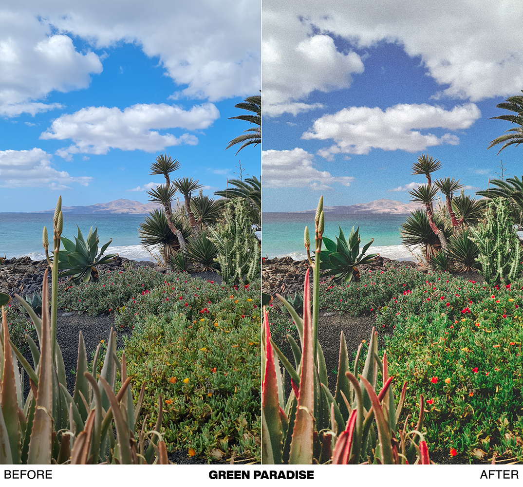 - GREEN PARADISE → great preset for photographs of greenery and green landscapes. Turns a mobile snapshot into a vintage-looking green paradise postcard. Vibrant & lively colors.