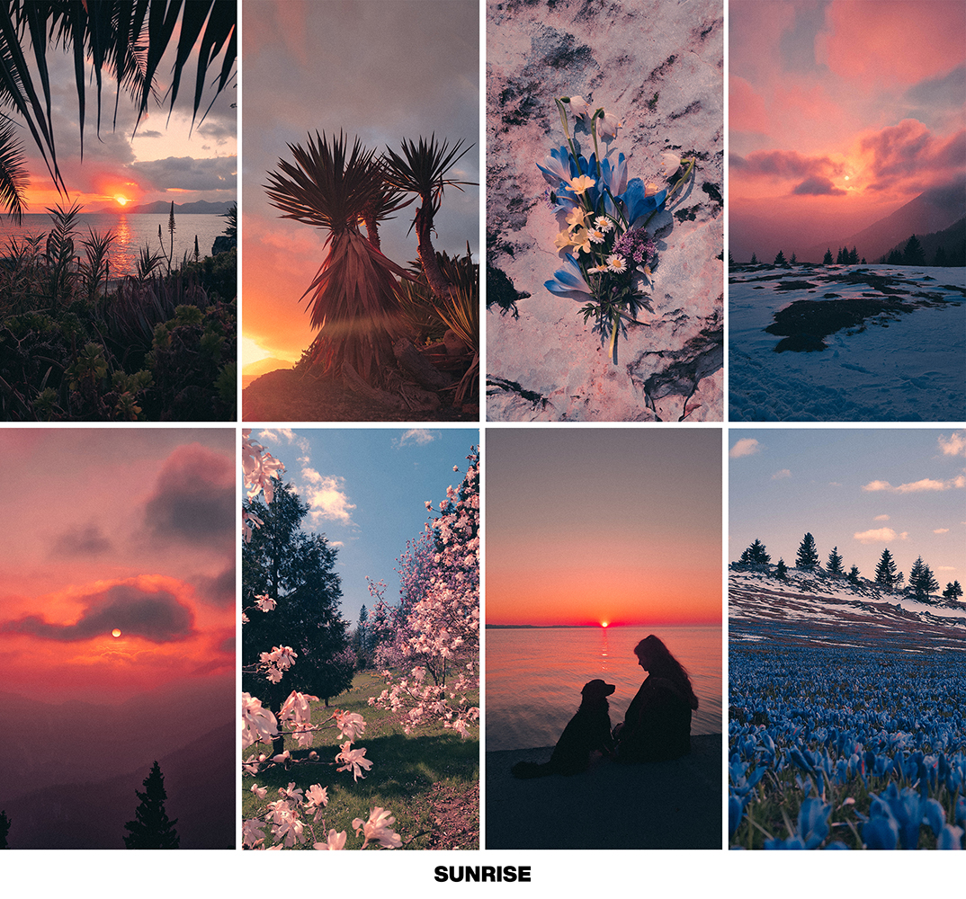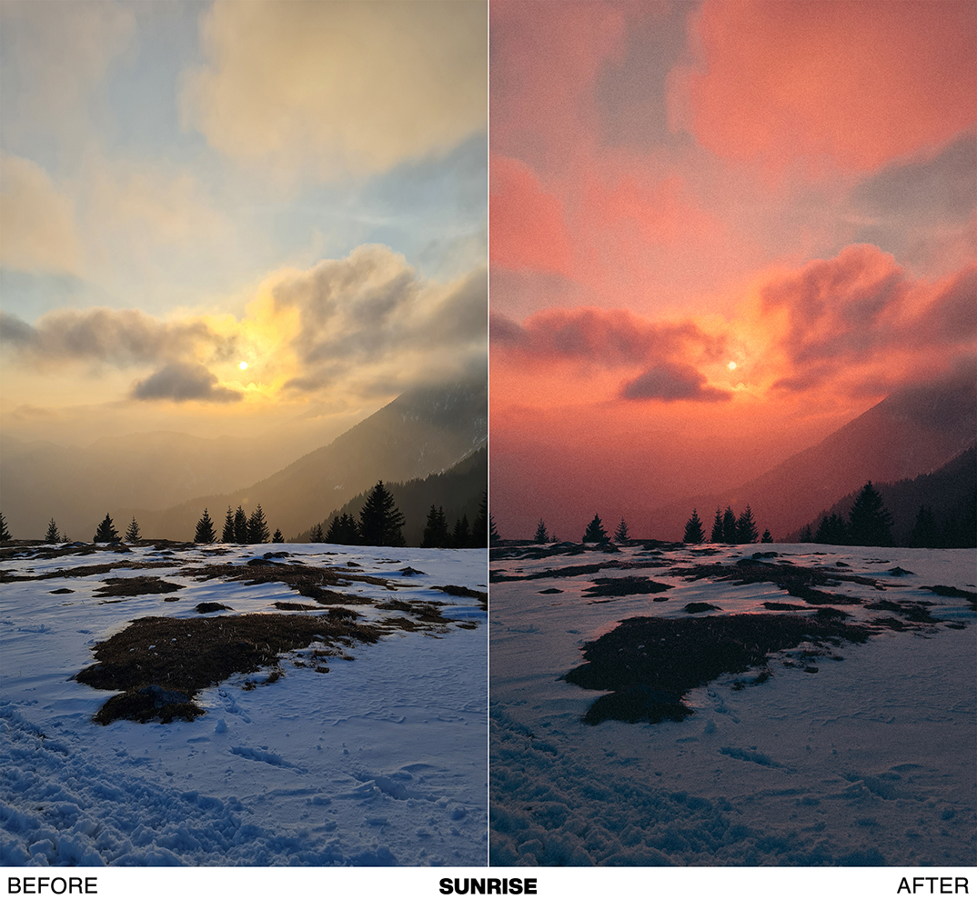 - SUNRISE → this preset creates the best results when used on photos taken at sunrise or sunset. It turns yellow sunset colors into peachy tones.