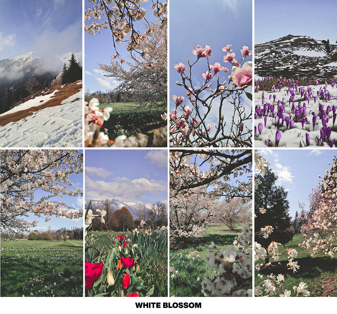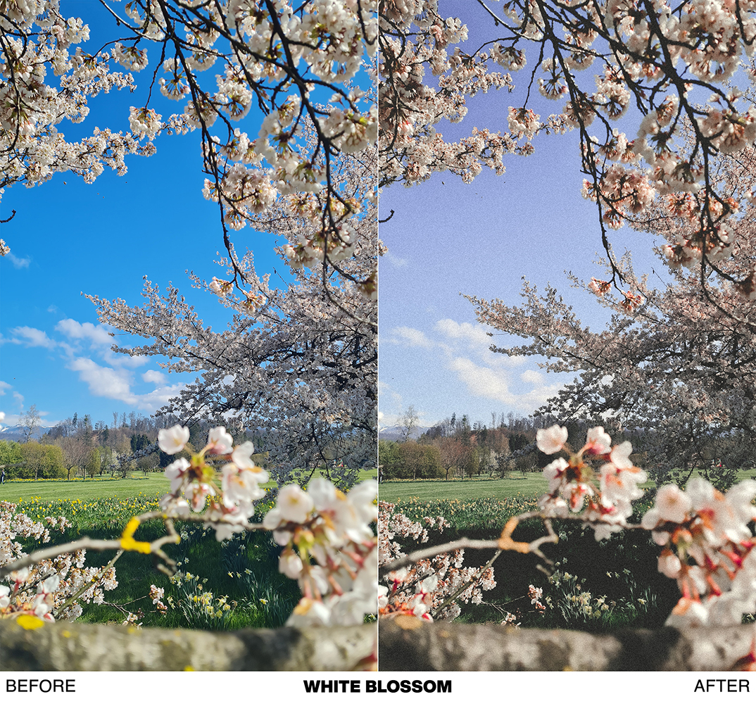 - WHITE BLOSSOM → vintage looking preset, works great on photos of white flowers or blooming trees. Faded film look.