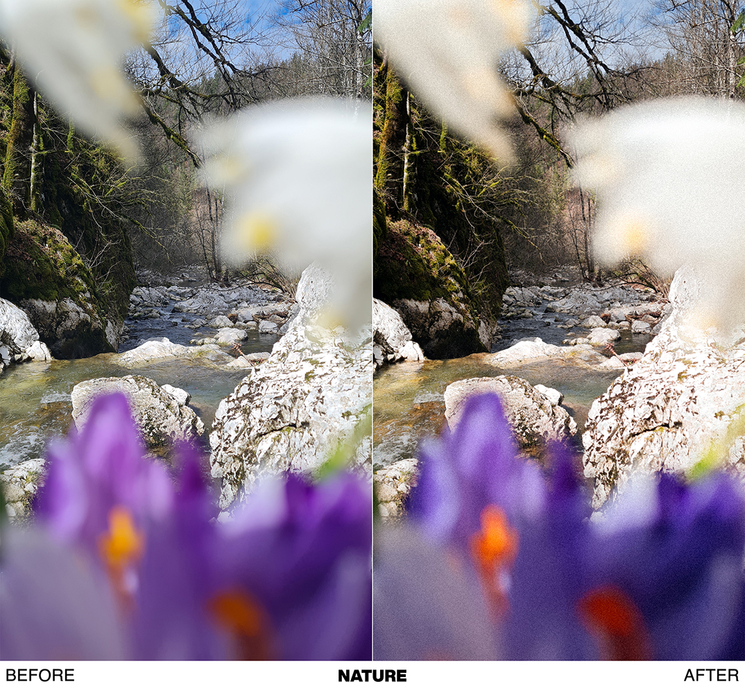 - NATURE → very natural and subtle preset, best for nature and landscape shots. Combination of vintage and modern look.