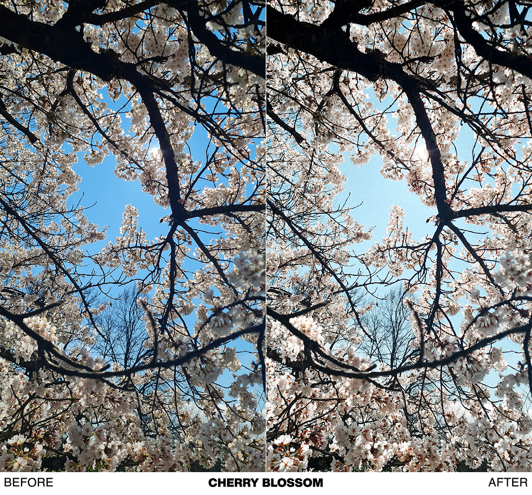 - CHERRY BLOSSOM → this preset creates the best results when used on photos of white flowers and white blooming trees. It creates a bright white contemporary look.
